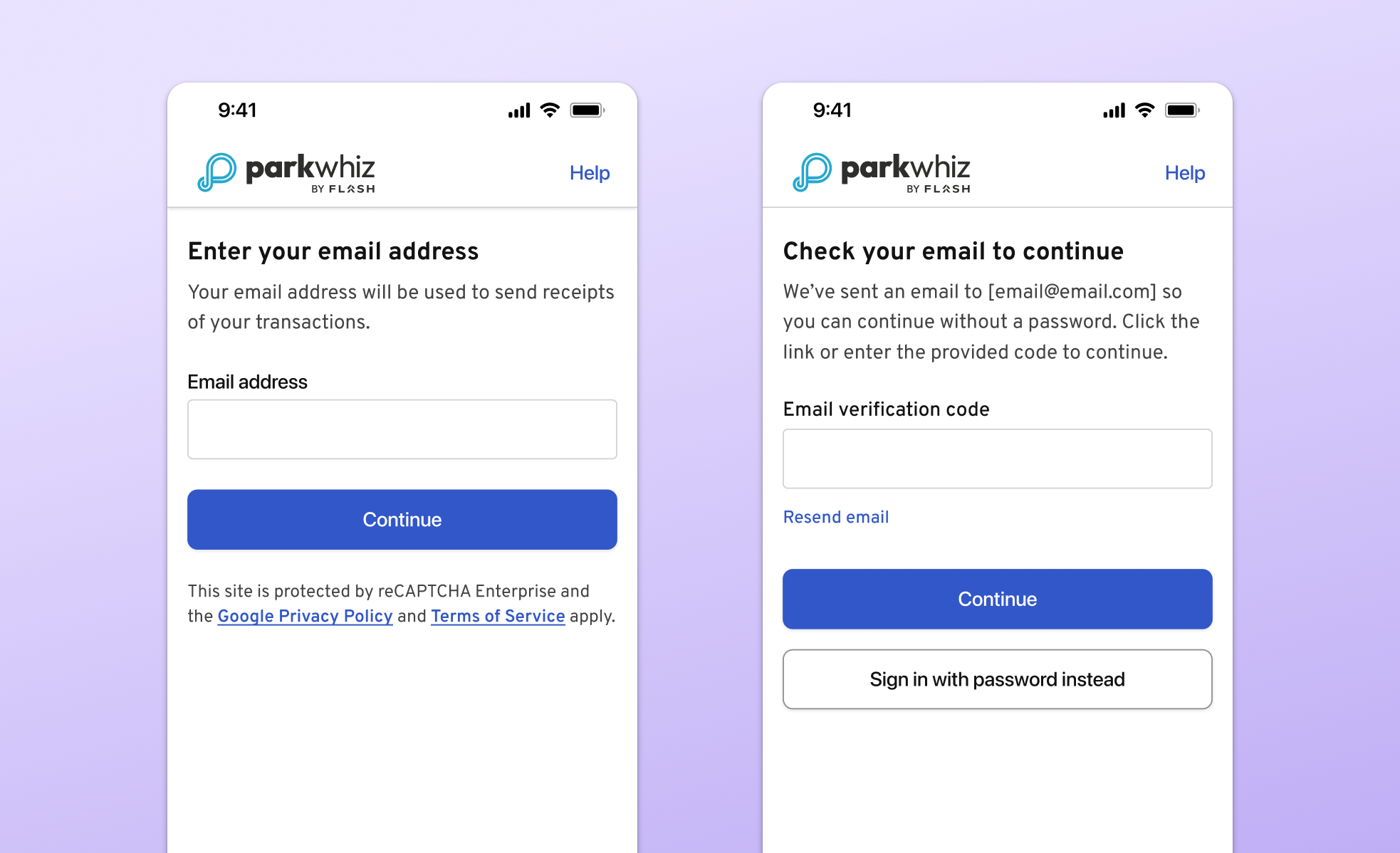 Email address entry and email verification code screens